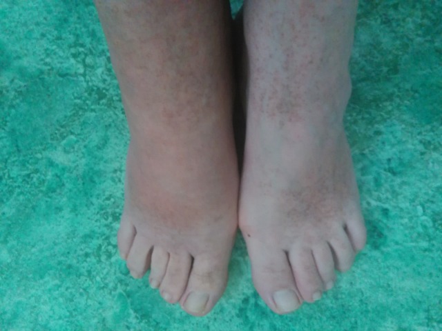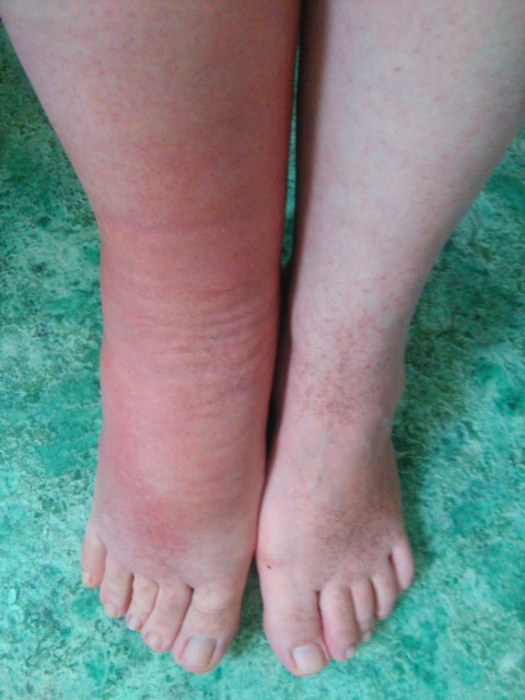 Wszystko idzie ku dobremu. Dzięki przepisanemu przez panią dermatolog Dexapolcortowi (aerozol) i okładom z Borasolu, róża na nodze już niemal przekwitła, choć dokładnie miesiąc temu wyglądała tak, jak na poniższym zdjęciu