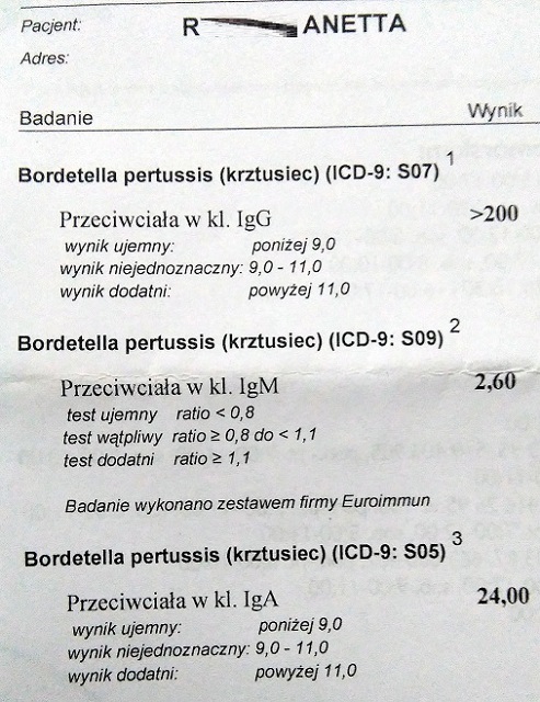 I tyle było rozmowy, a wizyta skończyła się bardzo szybko i w dość dziwnych okolicznościach - gdy ubierałam się po badaniu, ktoś zapukał do gabinetu i wszedł. Lekarka w pierwszej chwili poprosiła, żeby nie wchodził, ale gdy okazało się, że to jedna z pracownic przychodni z wynikiem EKG pacjenta, wpuściła ją, kazała jej usiąść i zaczekać, a mi wręczyła recepty - to było bardzo wymowne i odechciało mi się dalszej rozmowy z nią. Nic to, podczas styczniowej wizyty już na spokojnie oświecę panią doktor co do tego, że i dorośli na krztusiec chorują, o czym można przeczytać chociażby tutaj i jeszcze w kilku innych miejscach , a dla tych, którzy nie wiedzą, jak krztusi krztusiec - film na YT - po nim powinny wyświetlić się kolejne, ale nie oglądajcie tego przy jedzeniu.