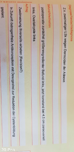 06.03.2019 usunięcie drugiego guza na lewym jajniku, na prawym trzy (potworniaki)